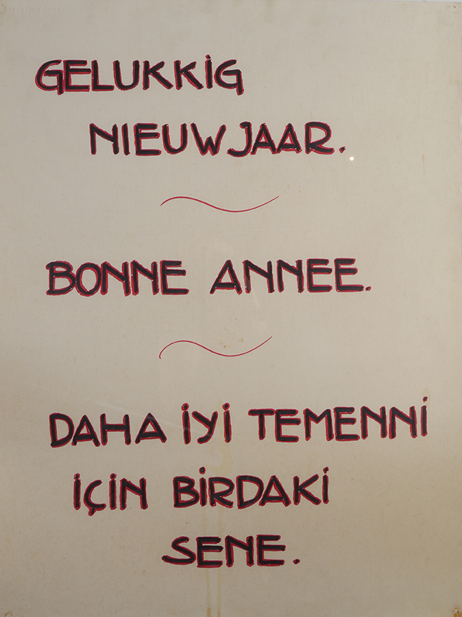 Informatieaffiche met nieuwjaarswensen getekend door Robert Van de Putte, technisch directeur van UCO Desmet-Guequier. Omdat de eerste arbeidsmigranten de Nederlandse taal nog niet machtig waren, is de boodschap in verschillende talen opgesteld.