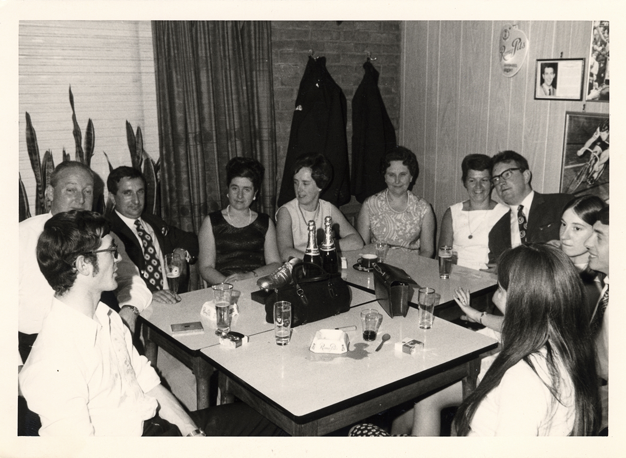 Binnenzicht op de uitreiking van de eerste Gouden Schoen bij FC Howag in 1971, de voetbalploeg opgericht door de vriendenkring Howag van het treinpersoneel van station Gent-Sint-Pieters. 'Howag' staat voor 'Hoofdwachters en wachters van het treinpersoneel uit Gent-Sint-Pieters'. Het feest gaat door in Sint-Amandsberg. Enkele mensen zitten rond de tafel iets te drinken. Centraal staat de Gouden Schoen, die vanaf dan jaarlijks wordt uitgereikt aan de meest verdienstelijke speler van de voetbalploeg.