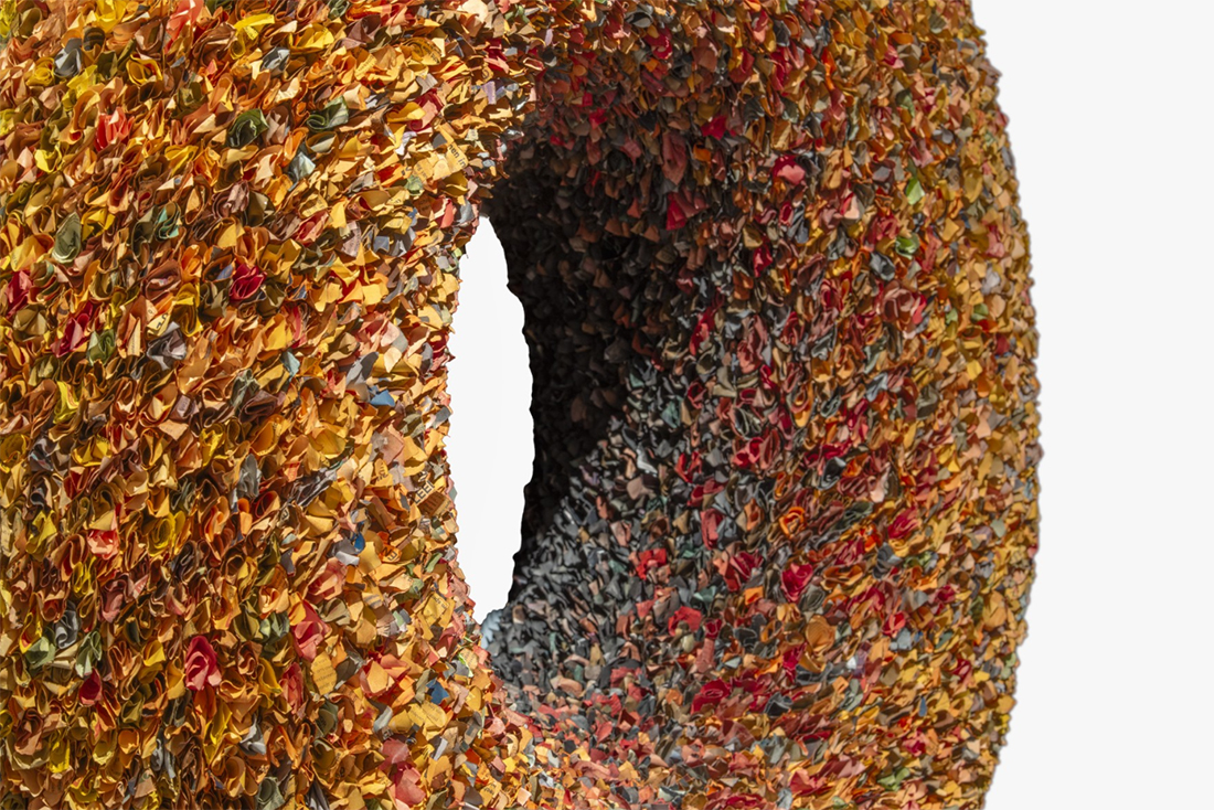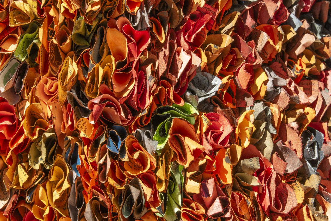 Kunstenaar Annita Smit verwerkte het vele papier in een nieuw werk. Dat is een vorm van upcycling, maar vooral een reflectie op de veelheid van organisaties die mensen helpen, en op hun pogingen om anderen voor hun acties warm te maken.