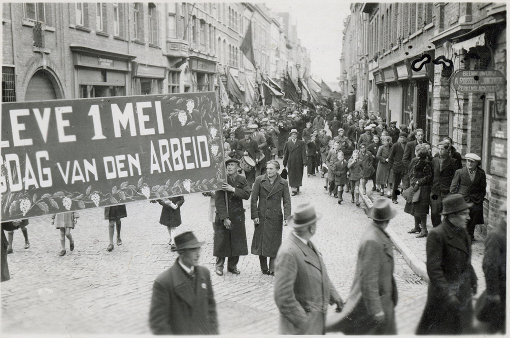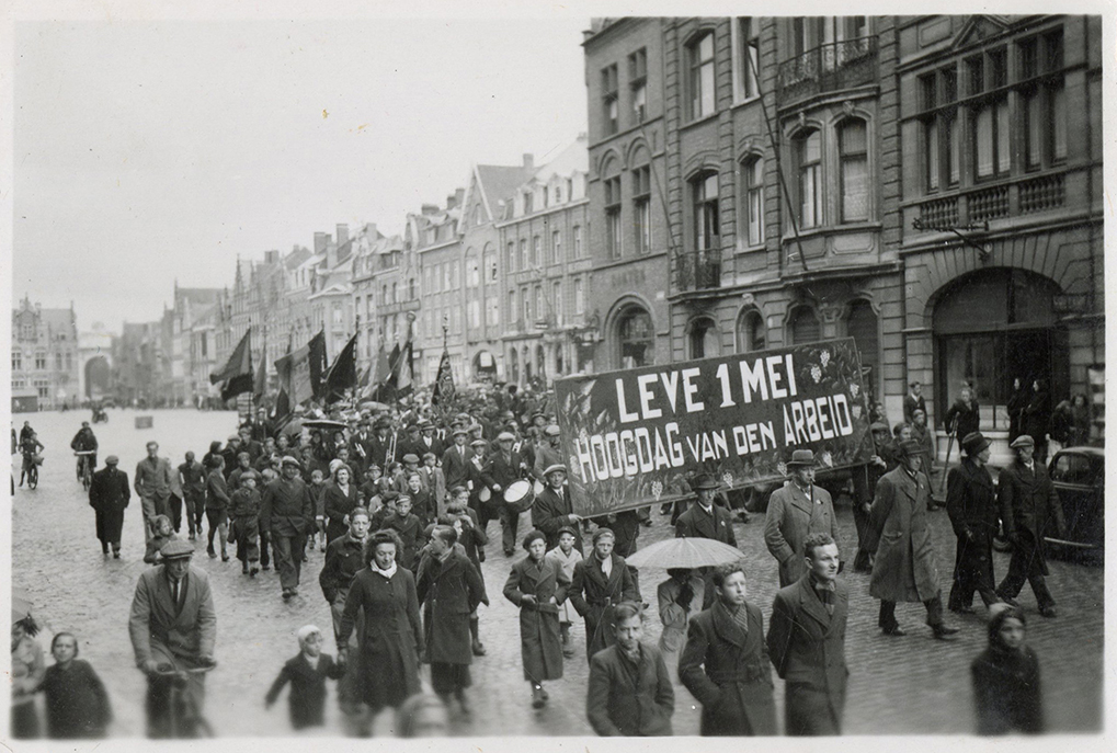 Op de zwart-witfoto’s zie je de stoet op 1 mei 1945 in Ieper. Er wordt een spandoek gedragen met het opschrift: "Leve 1 mei – Hoogdag van den arbeid.” De eerste foto (174) is genomen in de Boterstraat. De tweede (175) op de Neermarkt met zicht op de Grote Markt.
