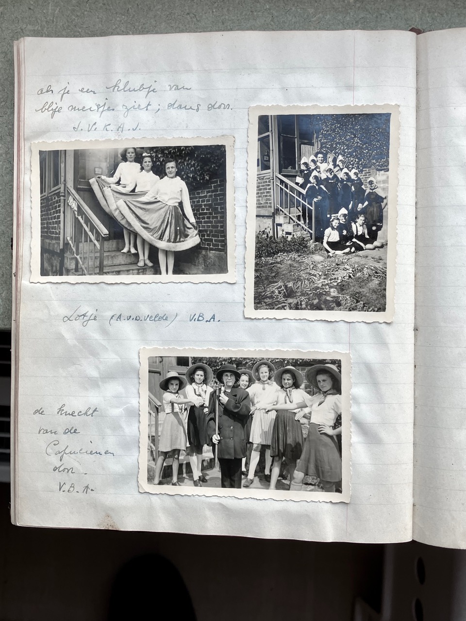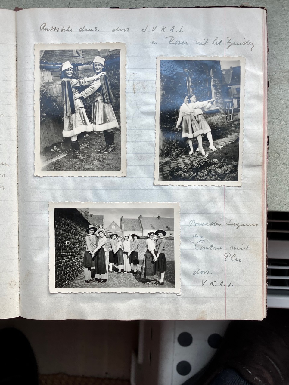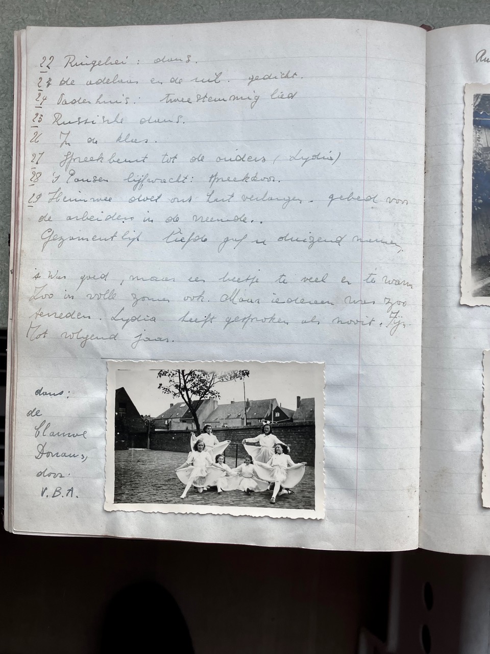 Oorspronkelijk dacht ik dat het Oorlogsdagboek van de VKAJ Heist-aan-zee, bijgehouden door mijn moeder Vé Desmedt, niet helemaal beantwoordde aan wat Brood & Rozen precies in gedachten had. Na uw mail van 16 december aan Victoria begreep ik beter wat het begrip “ontspanning in oorlogstijd” in ruimere zin inhield. Als ik het dagboek in kwestie opnieuw bekeek, merkte ik dat de VKAJ van Heist in de oorlog een jeugdgroepering was die heel veel energie stak in vrijetijdsbesteding. Toegegeven, het ging niet meteen over kunst, literatuur of onderwijs, maar het hele dagboek zit propvol beschrijvingen van feestelijke bijeenkomsten, met dans, zang, theater, spel, clubjes, turnen, wandelingen e.d.m.. Op de eerste pagina’s van het dagboek staat het woord “ontspanning” trouwens in het programma ingebeiteld. Ik had daar nog geen foto's van gemaakt, die voeg ik hier voor de volledigheid toe.