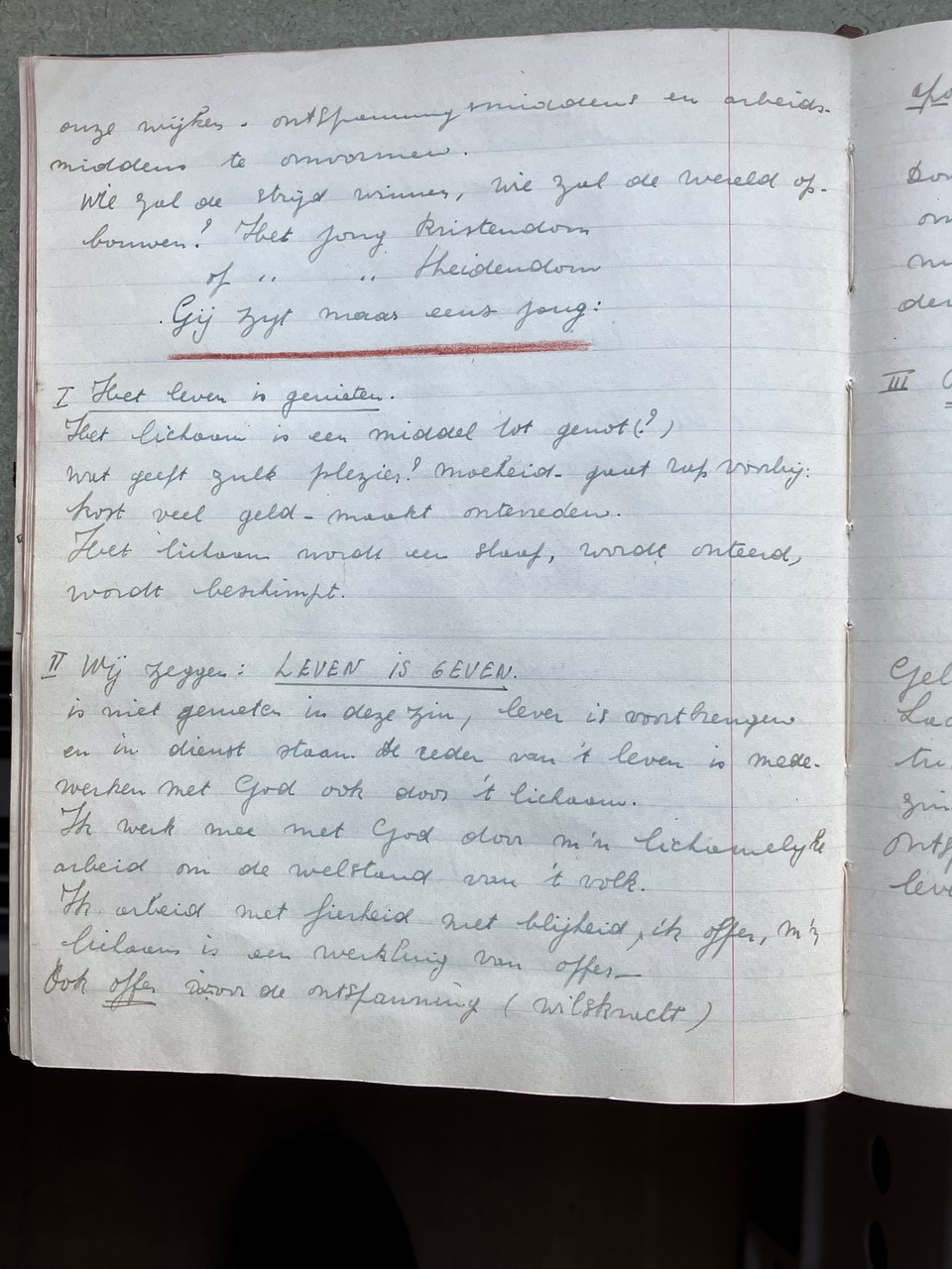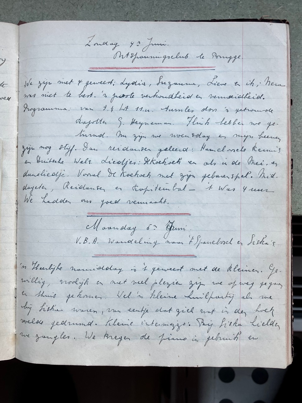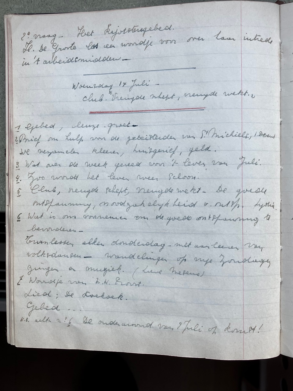 Oorspronkelijk dacht ik dat het Oorlogsdagboek van de VKAJ Heist-aan-zee, bijgehouden door mijn moeder Vé Desmedt, niet helemaal beantwoordde aan wat Brood & Rozen precies in gedachten had. Na uw mail van 16 december aan Victoria begreep ik beter wat het begrip “ontspanning in oorlogstijd” in ruimere zin inhield. Als ik het dagboek in kwestie opnieuw bekeek, merkte ik dat de VKAJ van Heist in de oorlog een jeugdgroepering was die heel veel energie stak in vrijetijdsbesteding. Toegegeven, het ging niet meteen over kunst, literatuur of onderwijs, maar het hele dagboek zit propvol beschrijvingen van feestelijke bijeenkomsten, met dans, zang, theater, spel, clubjes, turnen, wandelingen e.d.m.. Op de eerste pagina’s van het dagboek staat het woord “ontspanning” trouwens in het programma ingebeiteld. Ik had daar nog geen foto's van gemaakt, die voeg ik hier voor de volledigheid toe.