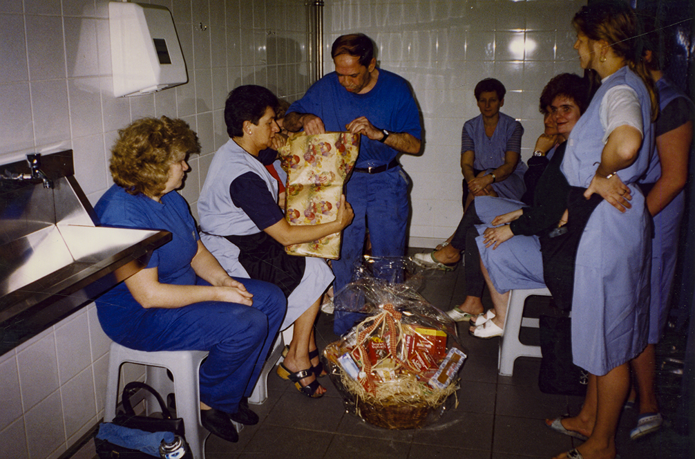 Een arbeider opent een geschenk midden in een groep arbeidsters. Foto genomen ter gelegenheid van de viering van het pensioen van een personeelslid van de weverij in textielfabriek UCO E.J. Braun in de Maïsstraat, in de periode 1985-2000.