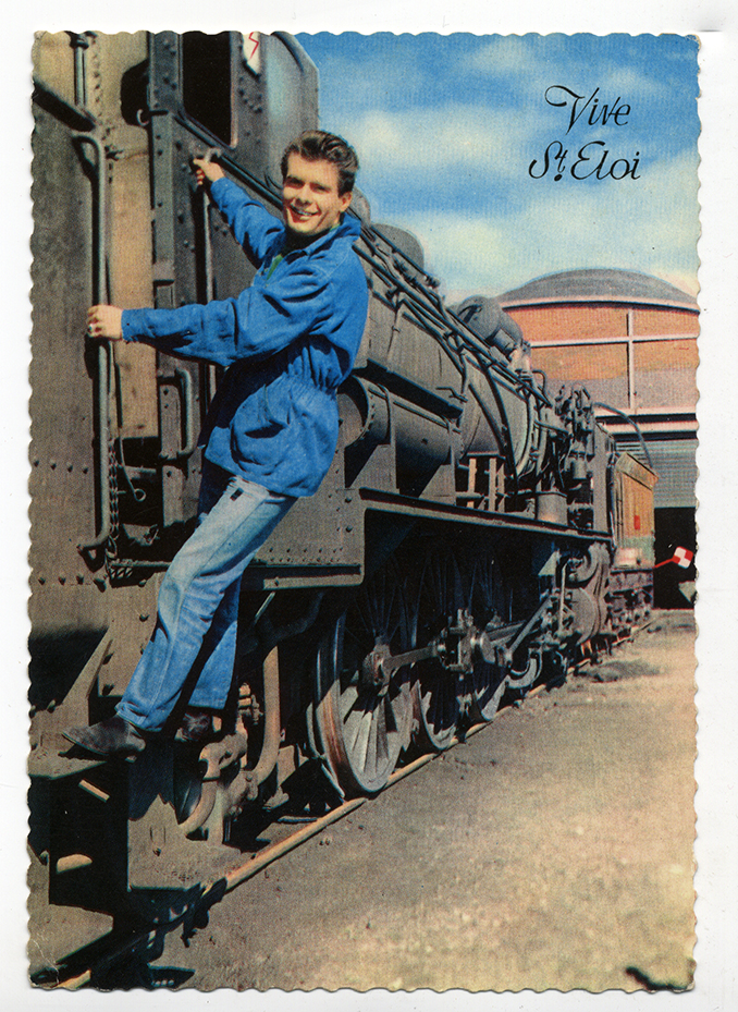 Postkaart met gefotografeerde afbeelding van een machinist en locomotief. Dit soort kaarten werd verstuurd naar aanleiding van het naamfeest van Sint-Elooi, de beschermheilige van de spoorwegen. De postkaart werd uitgegeven rond 1950 door Editions Superluxe.
