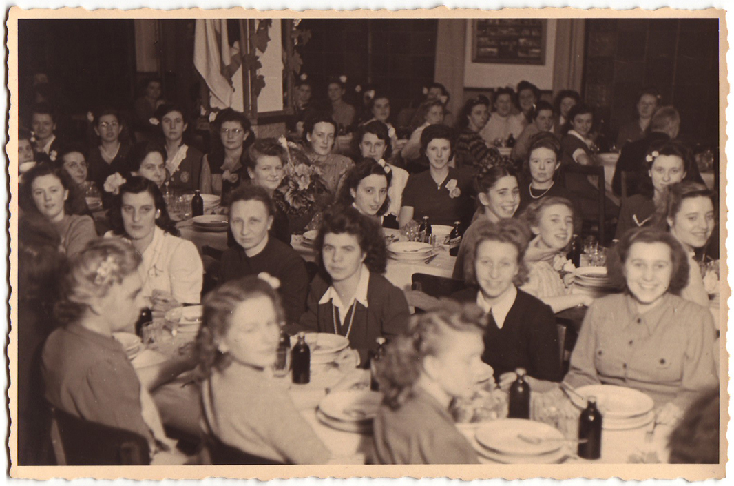 Arbeidsters van de fabriek Gaston Demeester te Gent aan gedekte tafels. Op zondag 5 december 1948 was er een dankmis en een plechtige zitting ter gelegenheid van het 75-jarig bestaan. Op maandag 6 december volgde een banket voor personeel en directie.
