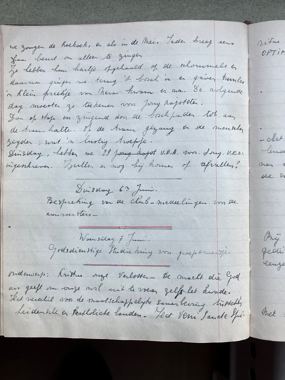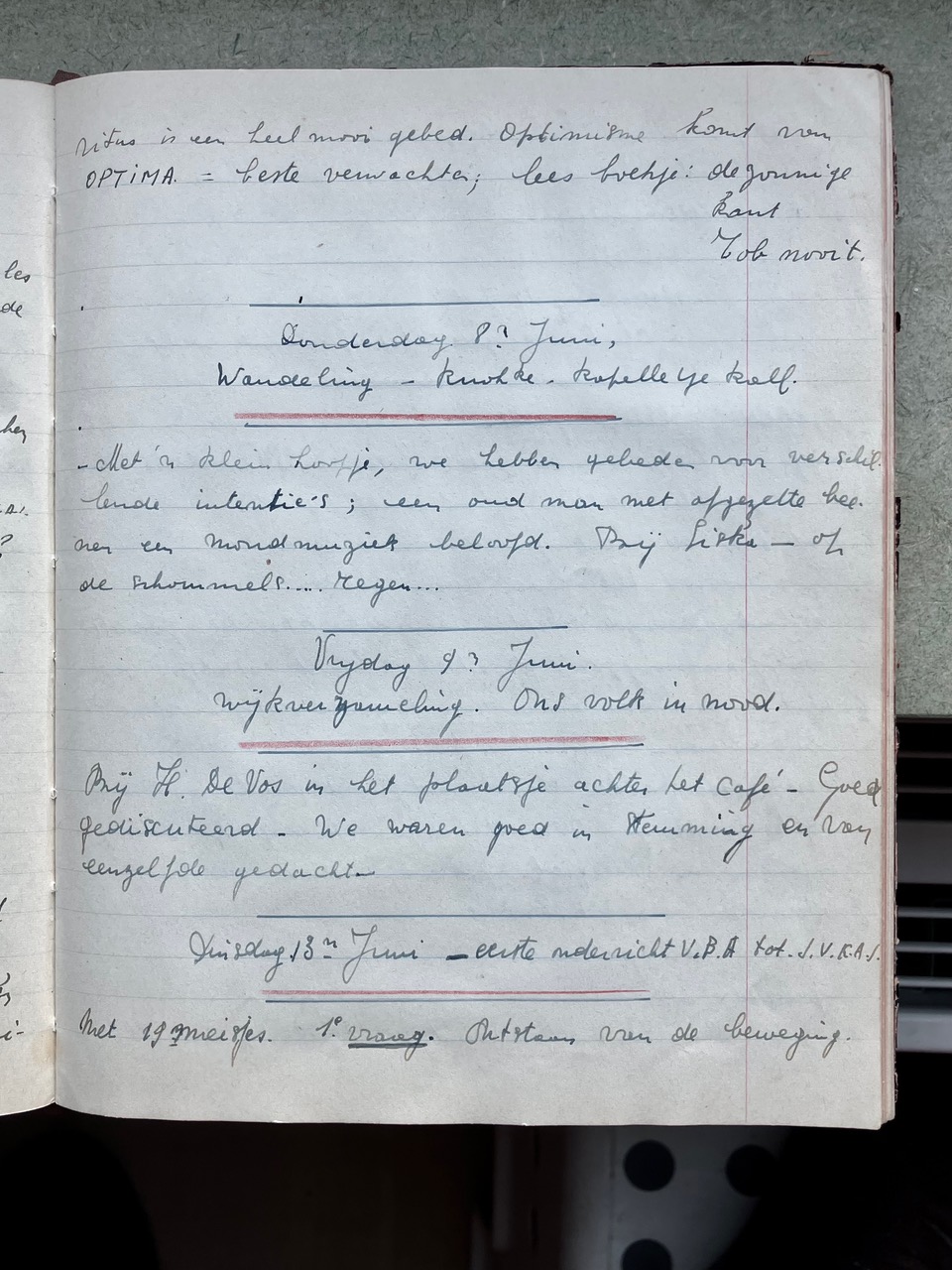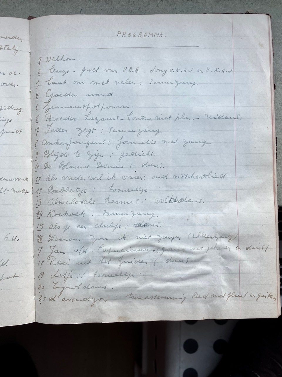 Oorspronkelijk dacht ik dat het Oorlogsdagboek van de VKAJ Heist-aan-zee, bijgehouden door mijn moeder Vé Desmedt, niet helemaal beantwoordde aan wat Brood & Rozen precies in gedachten had. Na uw mail van 16 december aan Victoria begreep ik beter wat het begrip “ontspanning in oorlogstijd” in ruimere zin inhield. Als ik het dagboek in kwestie opnieuw bekeek, merkte ik dat de VKAJ van Heist in de oorlog een jeugdgroepering was die heel veel energie stak in vrijetijdsbesteding. Toegegeven, het ging niet meteen over kunst, literatuur of onderwijs, maar het hele dagboek zit propvol beschrijvingen van feestelijke bijeenkomsten, met dans, zang, theater, spel, clubjes, turnen, wandelingen e.d.m.. Op de eerste pagina’s van het dagboek staat het woord “ontspanning” trouwens in het programma ingebeiteld. Ik had daar nog geen foto's van gemaakt, die voeg ik hier voor de volledigheid toe.