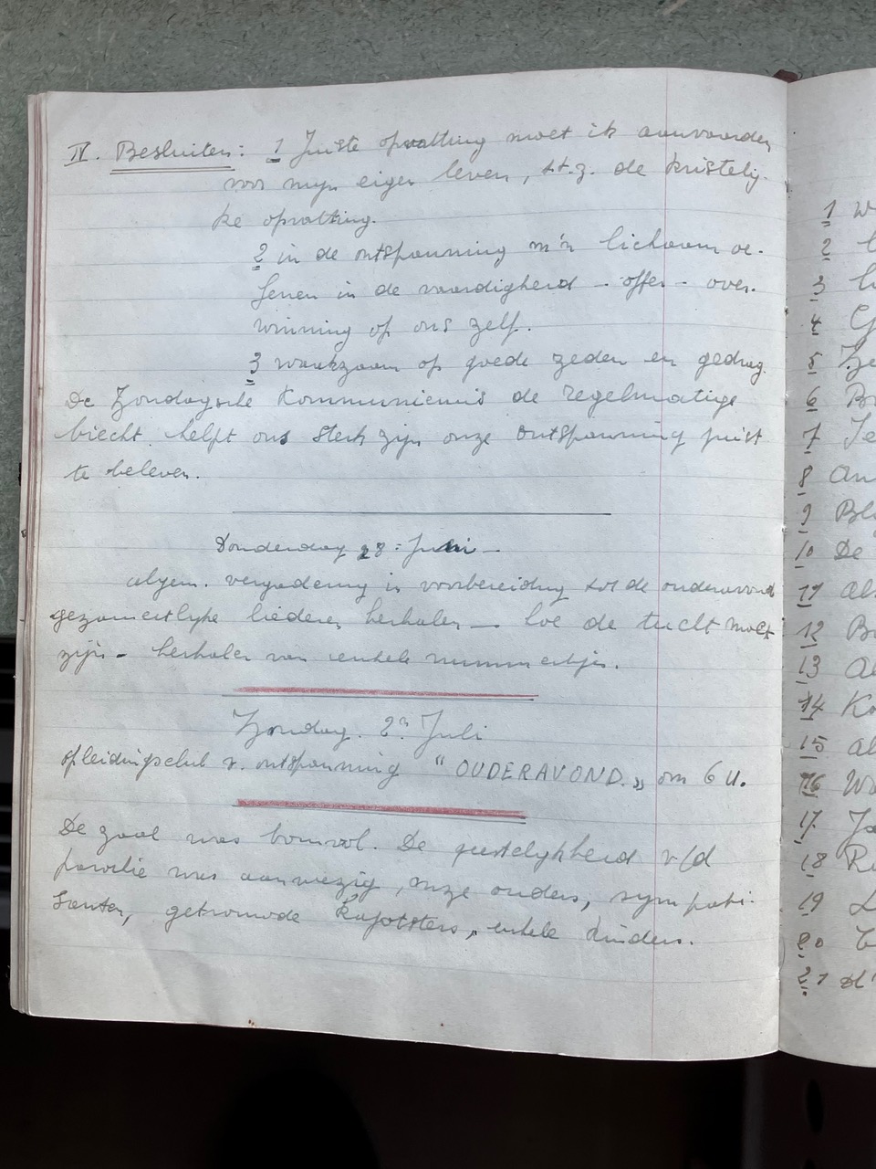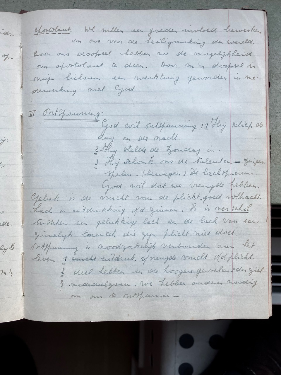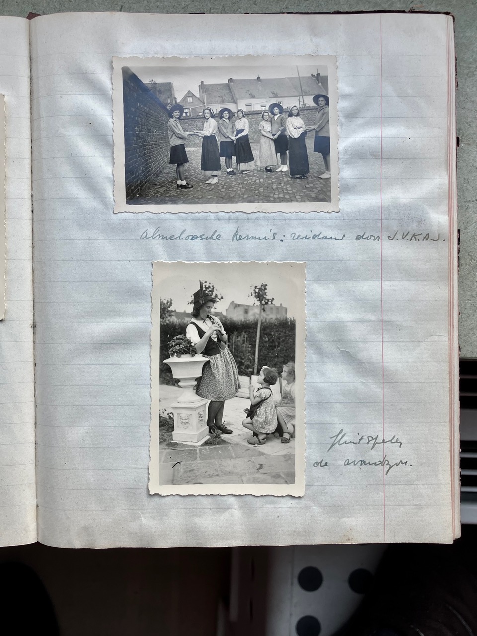 Oorspronkelijk dacht ik dat het Oorlogsdagboek van de VKAJ Heist-aan-zee, bijgehouden door mijn moeder Vé Desmedt, niet helemaal beantwoordde aan wat Brood & Rozen precies in gedachten had. Na uw mail van 16 december aan Victoria begreep ik beter wat het begrip “ontspanning in oorlogstijd” in ruimere zin inhield. Als ik het dagboek in kwestie opnieuw bekeek, merkte ik dat de VKAJ van Heist in de oorlog een jeugdgroepering was die heel veel energie stak in vrijetijdsbesteding. Toegegeven, het ging niet meteen over kunst, literatuur of onderwijs, maar het hele dagboek zit propvol beschrijvingen van feestelijke bijeenkomsten, met dans, zang, theater, spel, clubjes, turnen, wandelingen e.d.m.. Op de eerste pagina’s van het dagboek staat het woord “ontspanning” trouwens in het programma ingebeiteld. Ik had daar nog geen foto's van gemaakt, die voeg ik hier voor de volledigheid toe.