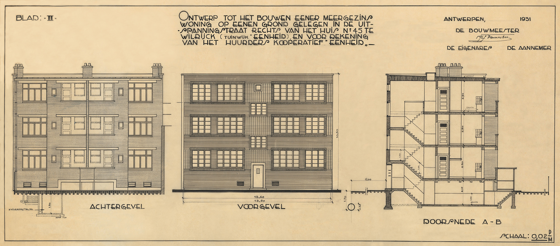 Na de aankoop van een geschikt bouwterrein in Wilrijk, ging het coöperatief Eenheid via een openbare prijsvraag op zoek naar een architect. De wedstrijdjury was samengesteld op basis van de beroepsverenigingen van de belanghebbenden. Vanaf 1923 werden diverse types eengezinswoningen gerealiseerd door verschillende architecten. Zo ontwierp Eduard Van Steenbergen in 1926 vijftien arbeiderswoningen in de Uitspanningstraat in opdracht van een "groep huizenbouwers" van de Minerva-fabriek. De uiterst eenvoudige gevels met gekoppelde portalen vertonen qua indeling een sterke verwantschap met het kleine huizentype in de Unitas-Tuinwijk in Deurne. Het modernistische appartementsgebouw aan de Uitspanningstraat 47 is een ontwerp van Alfons Francken uit 1931. Dezelfde architect was na de Tweede Wereldoorlog ook verantwoordelijk voor de vervanging van de vernielde woningen aan het Boeksveldplein en de Uitspanningstraat door een reeks eigentijdse wooncomplexen met 24 appartementen.